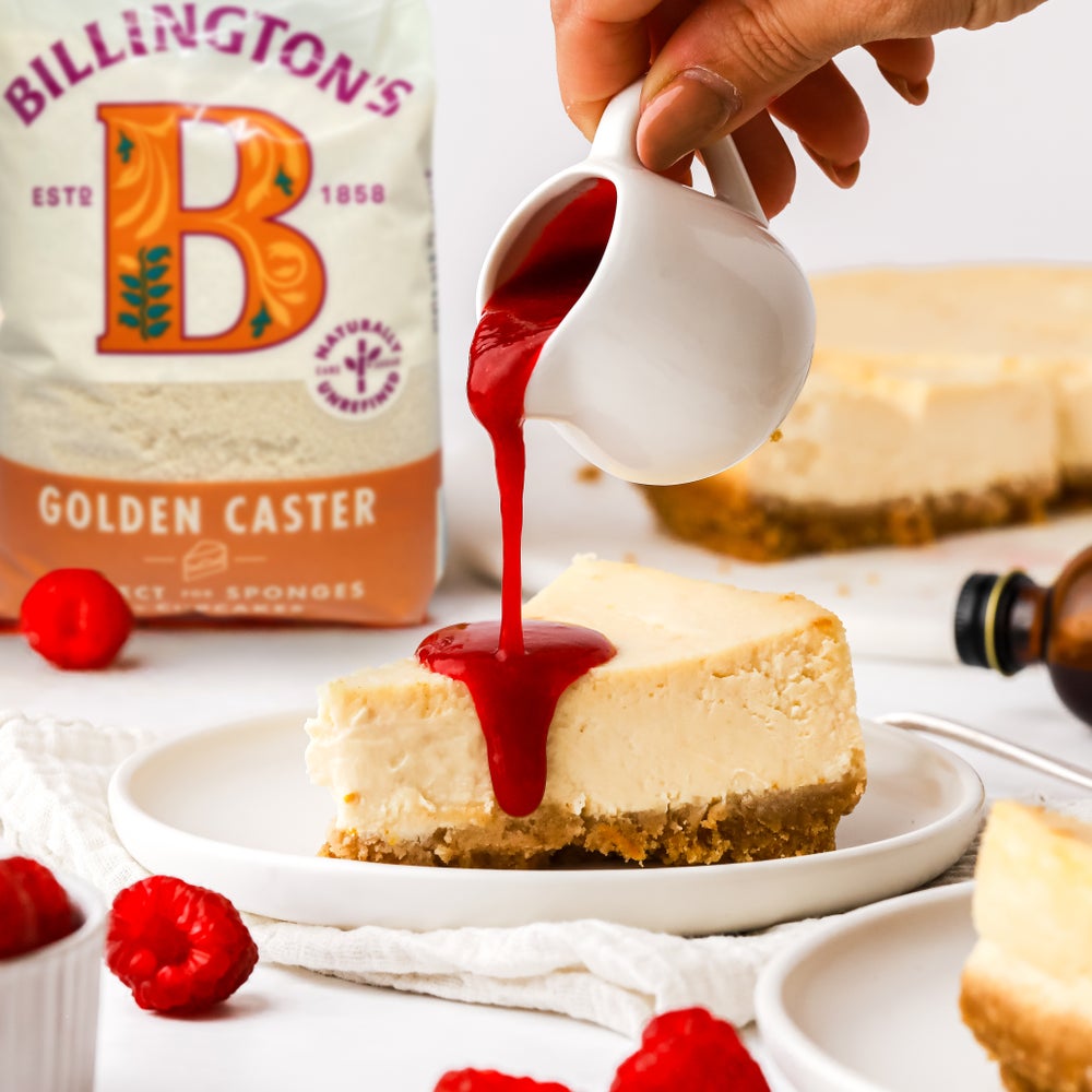 To serve, cut the cheesecake into wedges and drizzle over a little of the fresh raspberry sauce. You could also serve the cheesecake topped with a dollop of whipped double cream if you like.